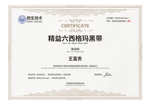 培训后经考试合格,学员将颁发鹏生《绿带培训合格证书》《黑带培训合格证书》(培训完的学员也可参加中国质量协会的六西格玛
