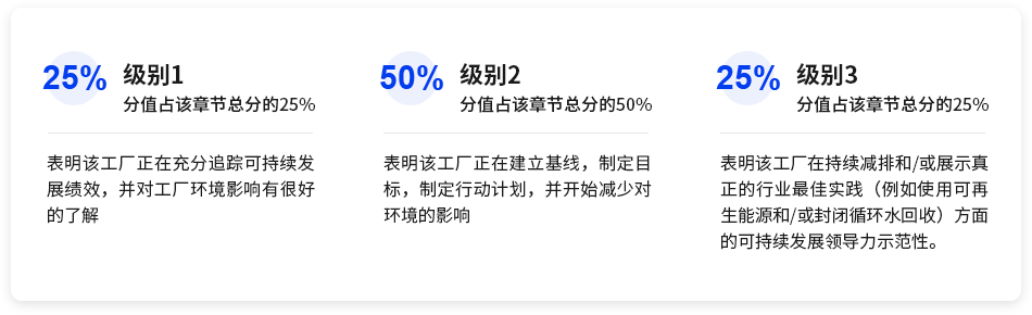 才能获得相应分数。每个部分包括一个三级结构(1 级,2 级和 3 级),它反映出环保做法的一般阈值