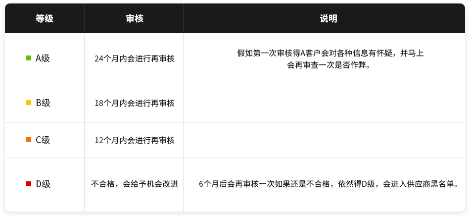 验厂分为预审和正式审核,预审通过后才能进行正式审核,正式审核通过后会给供应商评定等级。