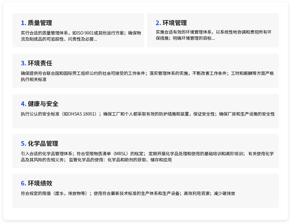 STeP评估框架共分为以下六大模块,分别为质量管理、环境管理、社会责任、健康与安全、化学品管理和环境绩效。STeP认证的前提条件是符合六个STeP模块中最低的特定要求。