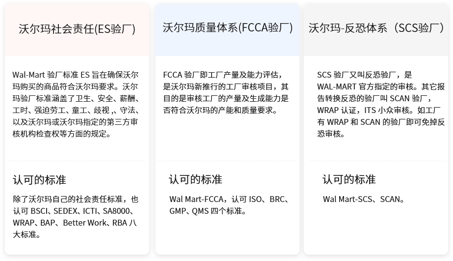 Walmart沃尔玛验厂是指沃尔玛按照一套严格的供应商标准系统对工厂进行审核或评估。目前沃尔玛针对所有供应商的标准审核主要包括社会责任(ES)、品质(FCCA)、反恐(SCS)三个方面,通过沃尔玛验厂是获取沃尔玛品牌商订单的必要前提条件,其中社会责任(ES)审核是沃尔玛验厂最核心部分。