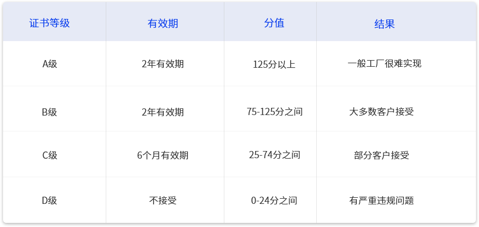 ICS验厂是按照打分制来划分等级,分为“ABCD”4个等级。